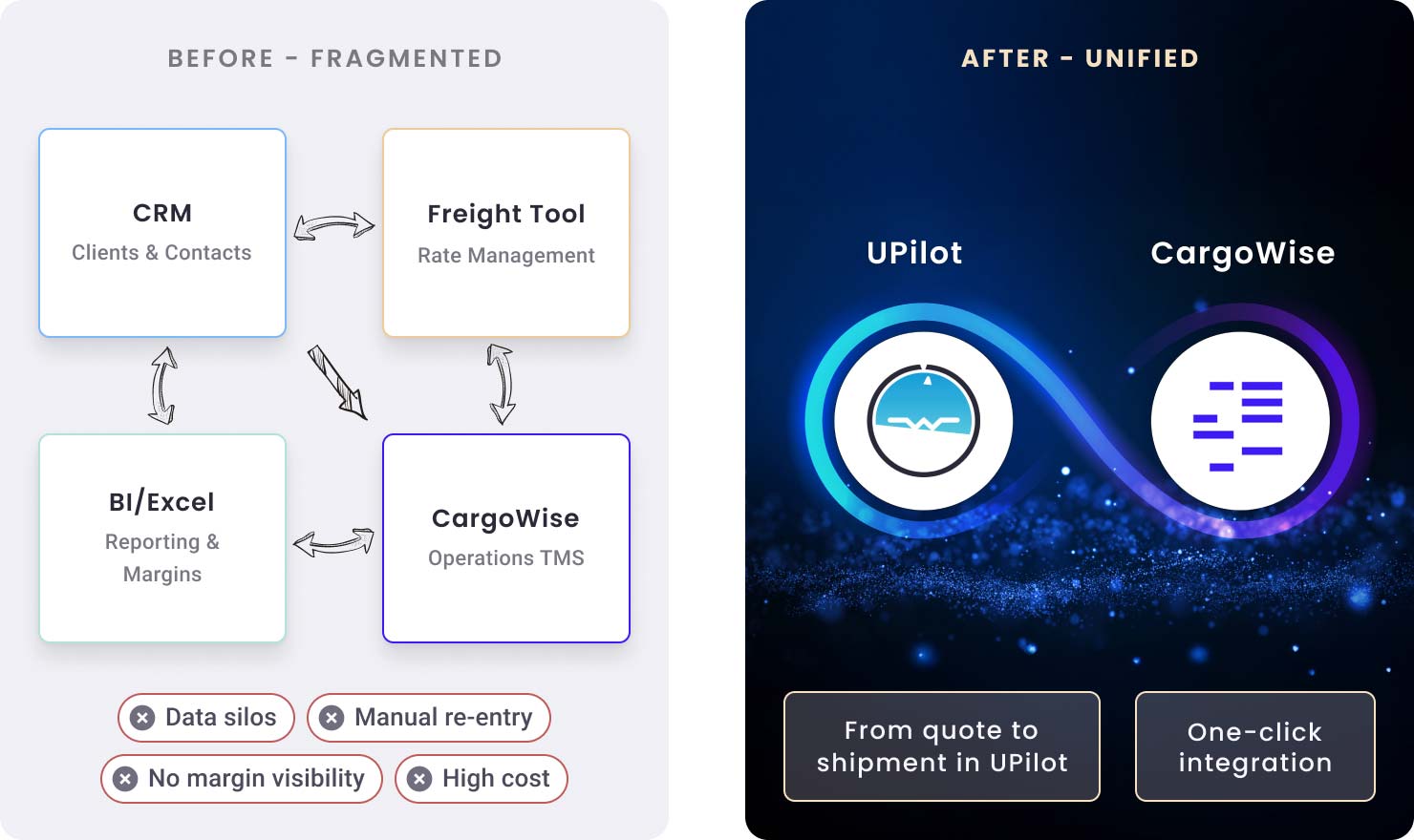 Most freight forwarders juggle disconnected systems — CRM, freight tools, BI platforms, Excel, and CargoWise. This fragmentation drives up costs and makes margin visibility nearly impossible.
