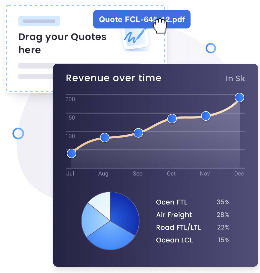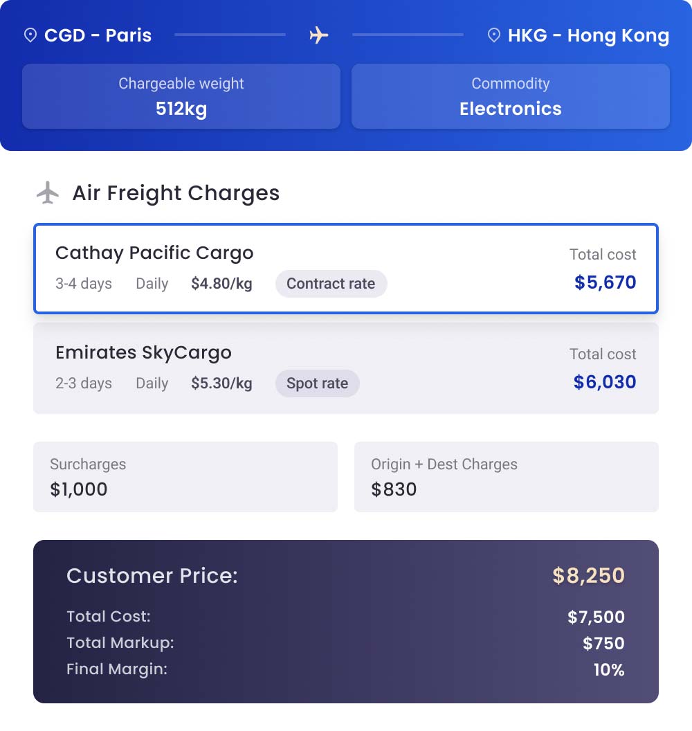 Build, compare, and send freight quotations with built-in trade lane logic and margin tracking.